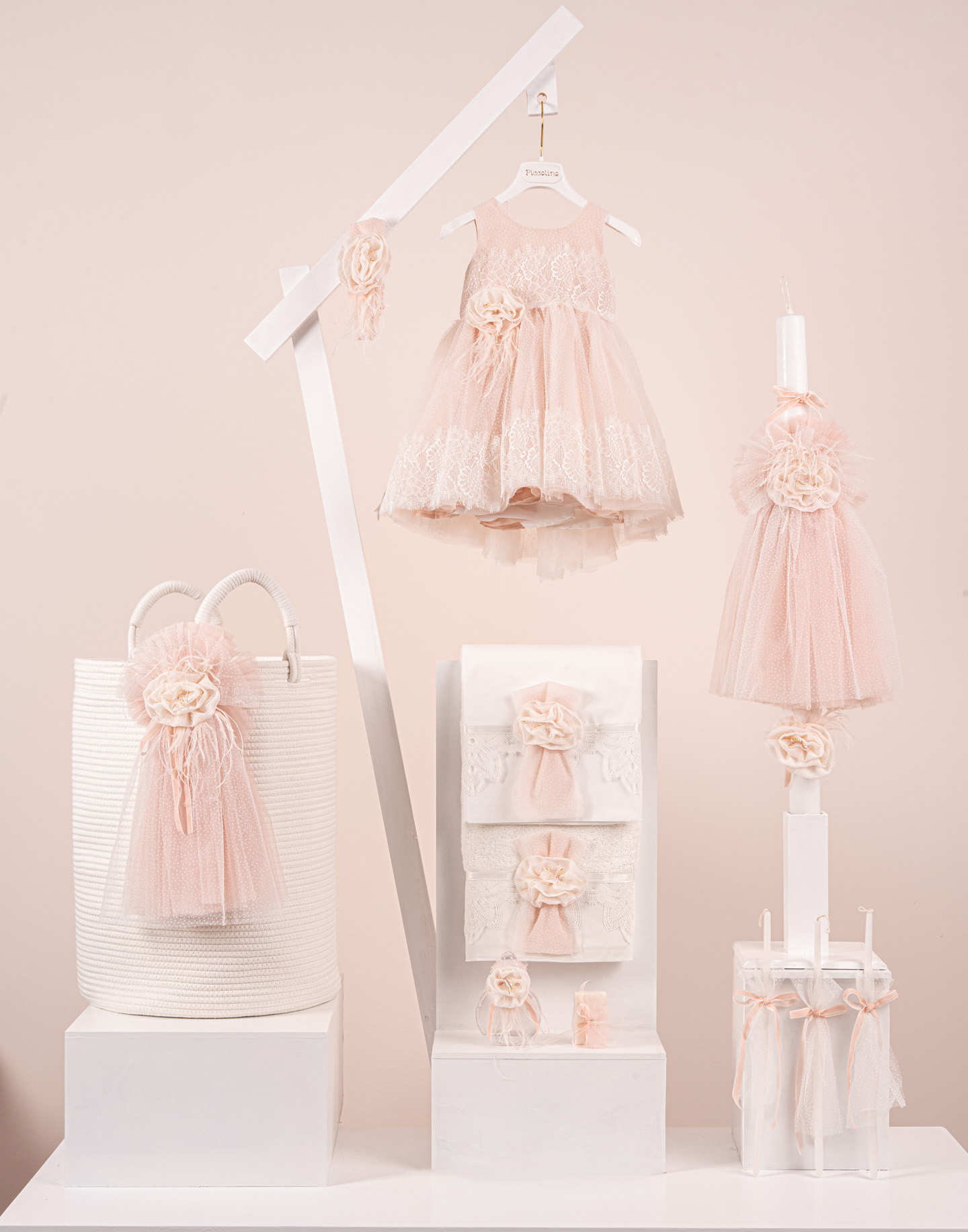 Βαπτιστικό πακέτο Piccolino Marcella peach περιλαμβάνει φόρεμα ,σετ λαδόπανα, λαμπάδα, λαδοσετ και στολισμένο barel off white