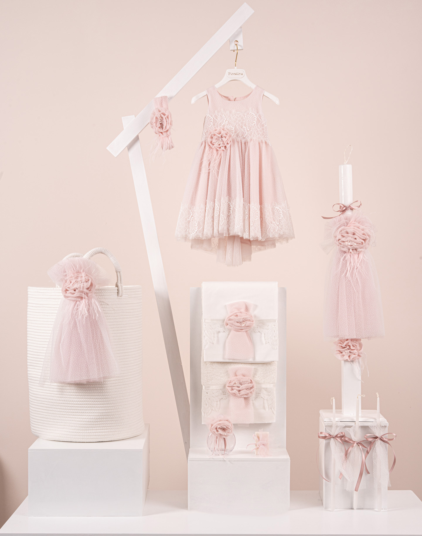 Βαπτιστικό πακέτο Piccolino Marcella pink περιλαμβάνει φόρεμα ,σετ λαδόπανα, λαμπάδα, λαδοσετ και στολισμένο barel off white