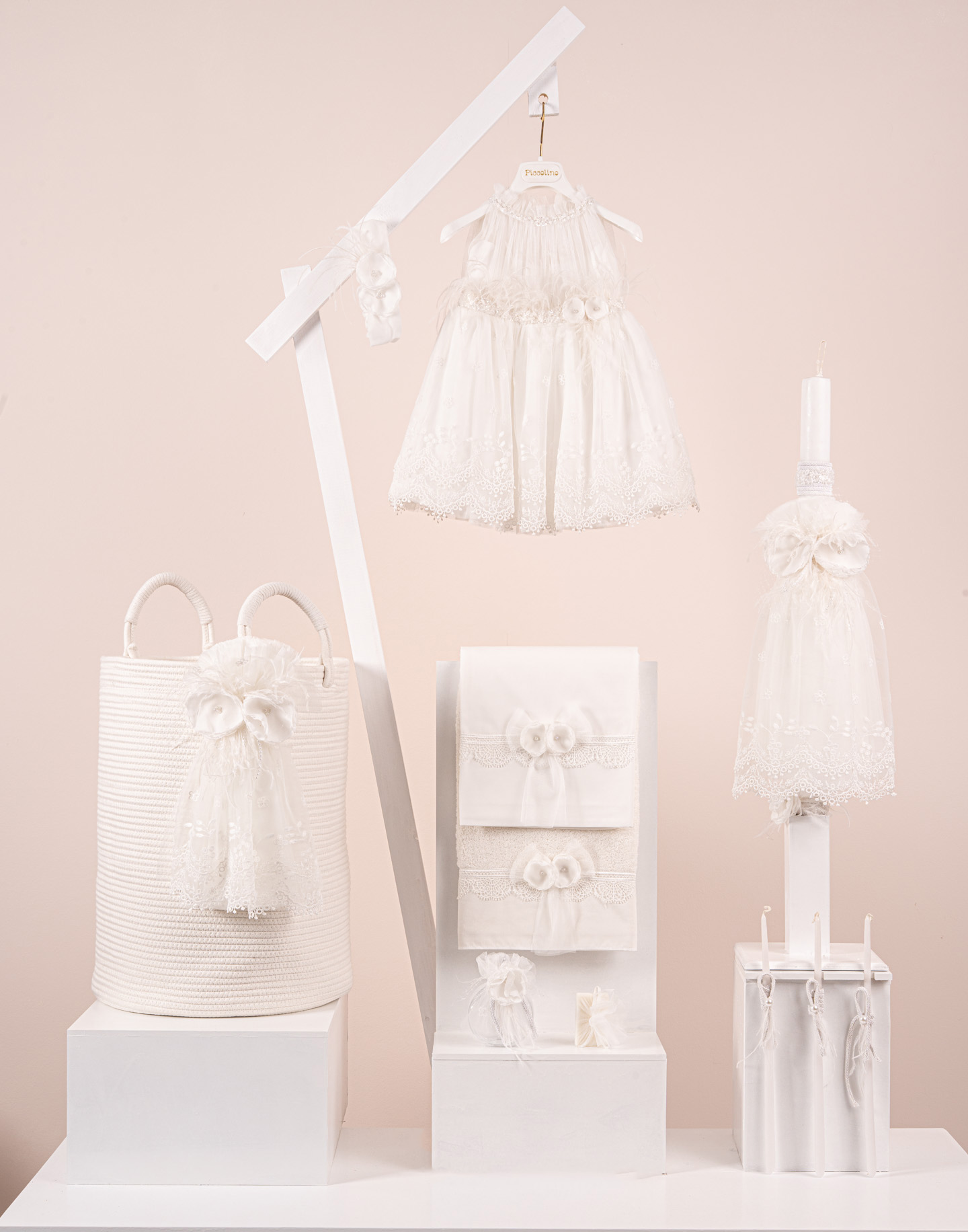 Βαπτιστικό πακέτο Piccolino Melody ivory περιλαμβάνει φόρεμα ,σετ λαδόπανα, λαμπάδα, λαδοσετ και στολισμένο barel off white