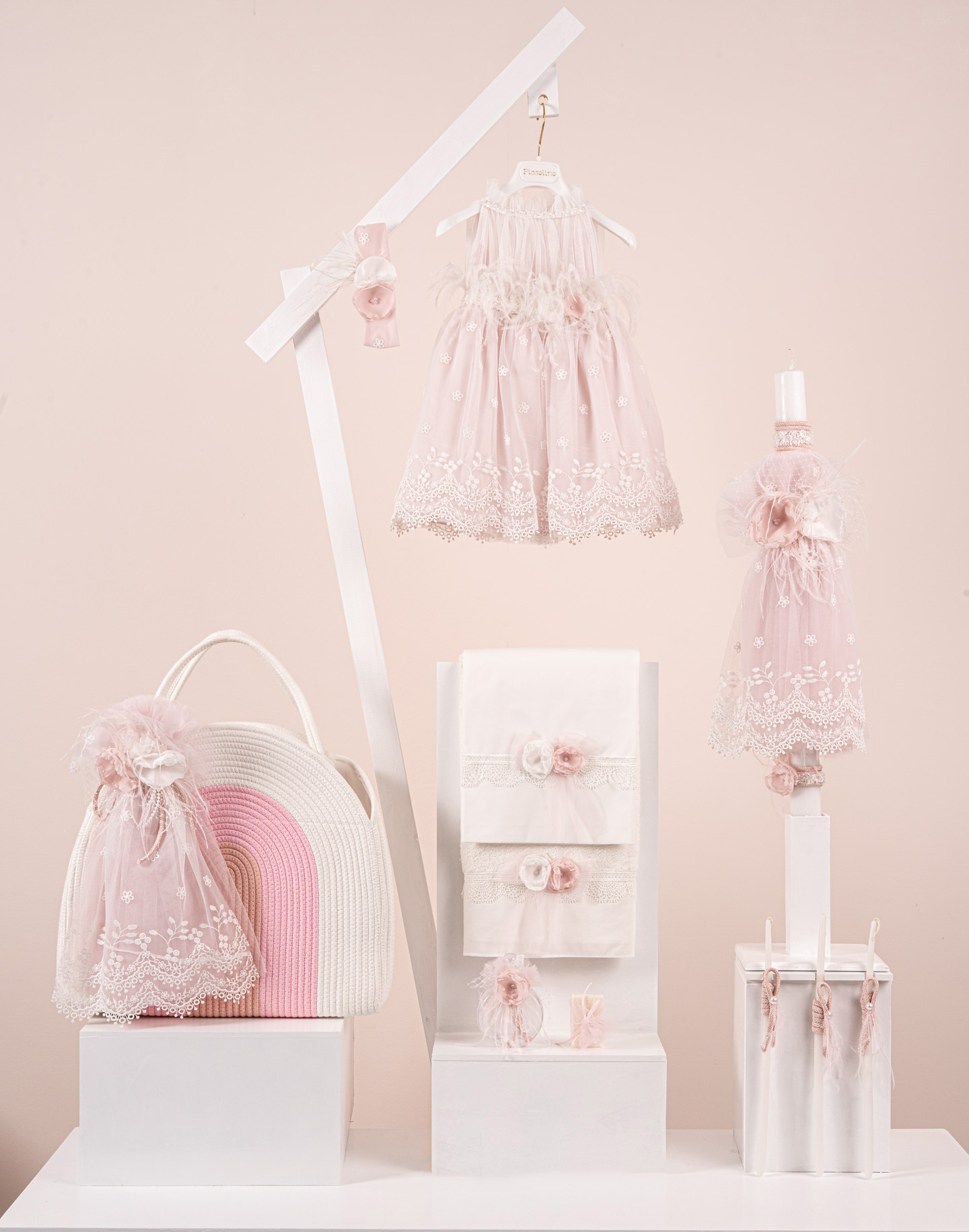 Βαπτιστικό πακέτο Piccolino Melody pink περιλαμβάνει φόρεμα ,σετ λαδόπανα, λαμπάδα, λαδοσετ και στολισμένη τσάντα ropes
