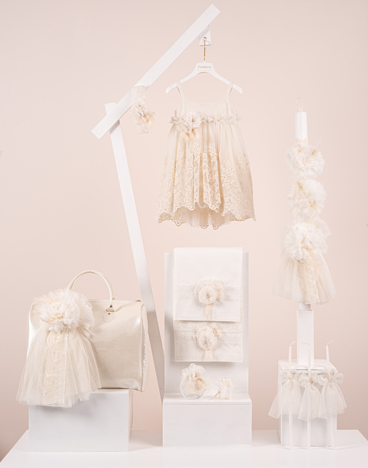 Βαπτιστικό πακέτο Piccolino Phillipa gold περιλαμβάνει φόρεμα ,σετ λαδόπανα, λαμπάδα, λαδοσετ και στολισμένη τσάντα