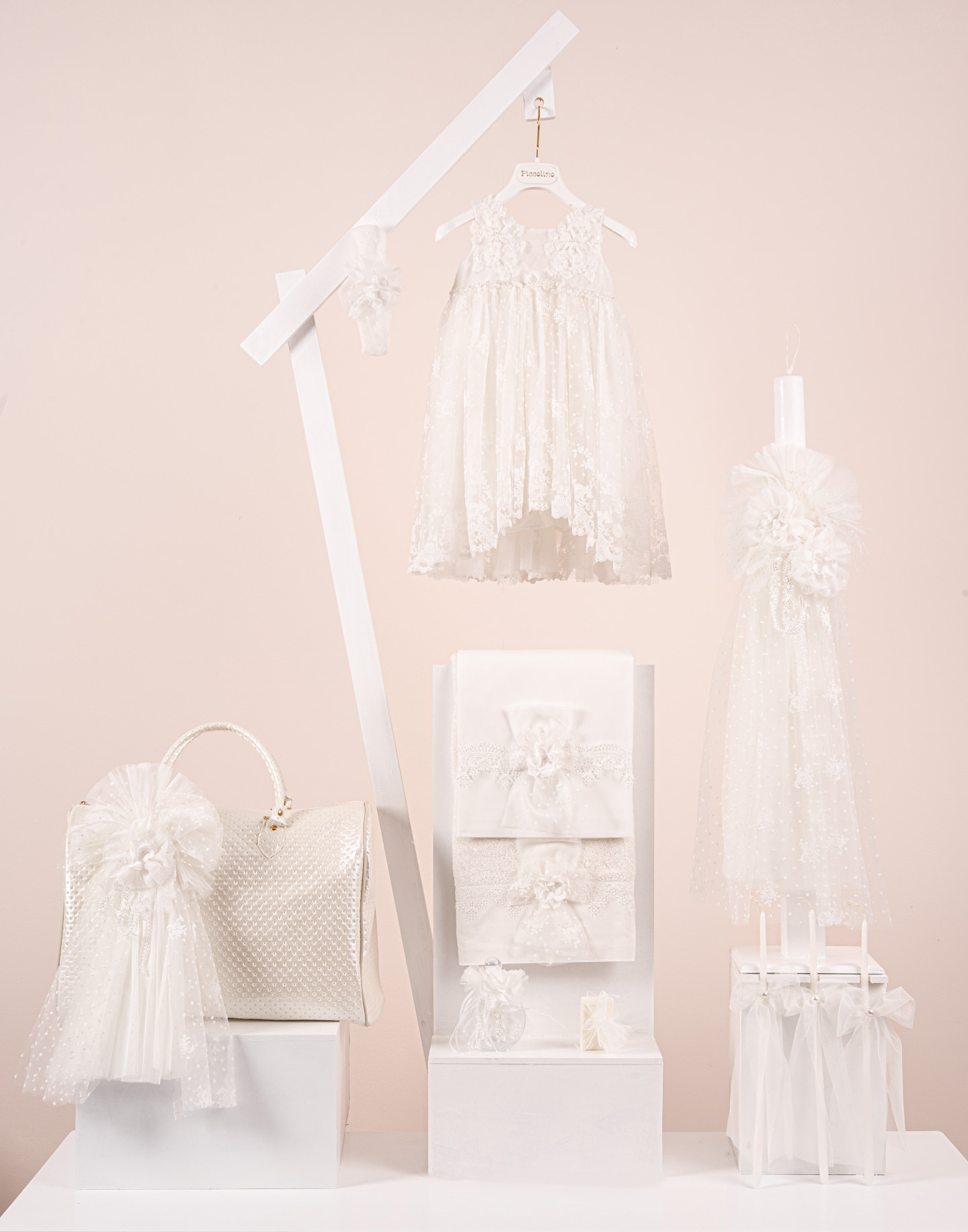 Βαπτιστικό πακέτο Piccolino Sienna ivory περιλαμβάνει φόρεμα ,σετ λαδόπανα, λαμπάδα, λαδοσετ και στολισμένη τσάντα καπιτονέ