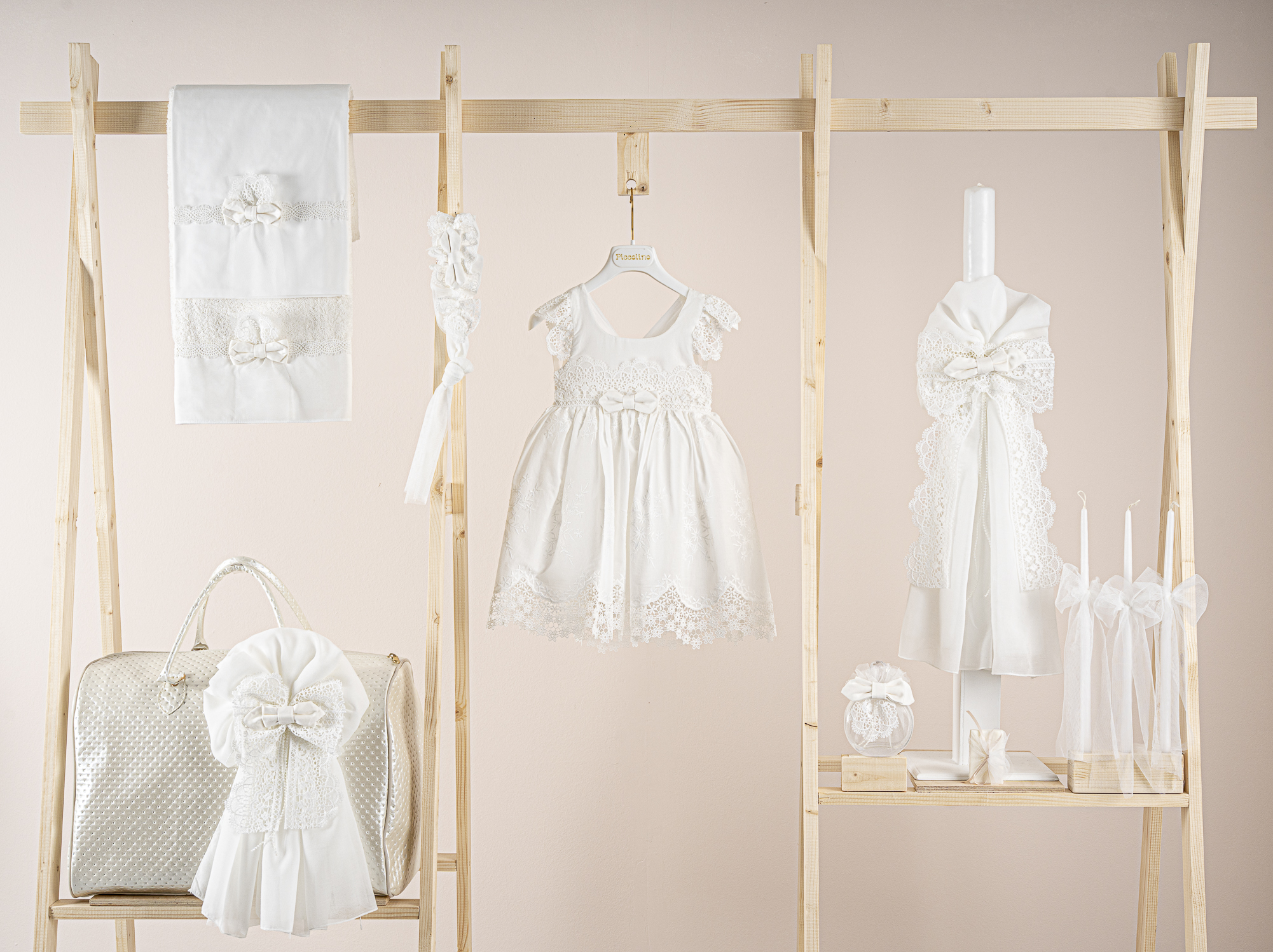 Βαπτιστικό πακέτο Piccolino Valerie ivory περιλαμβάνει φόρεμα ,σετ λαδόπανα, λαμπάδα, λαδοσετ και στολισμένη τσάντα καπιτονέ