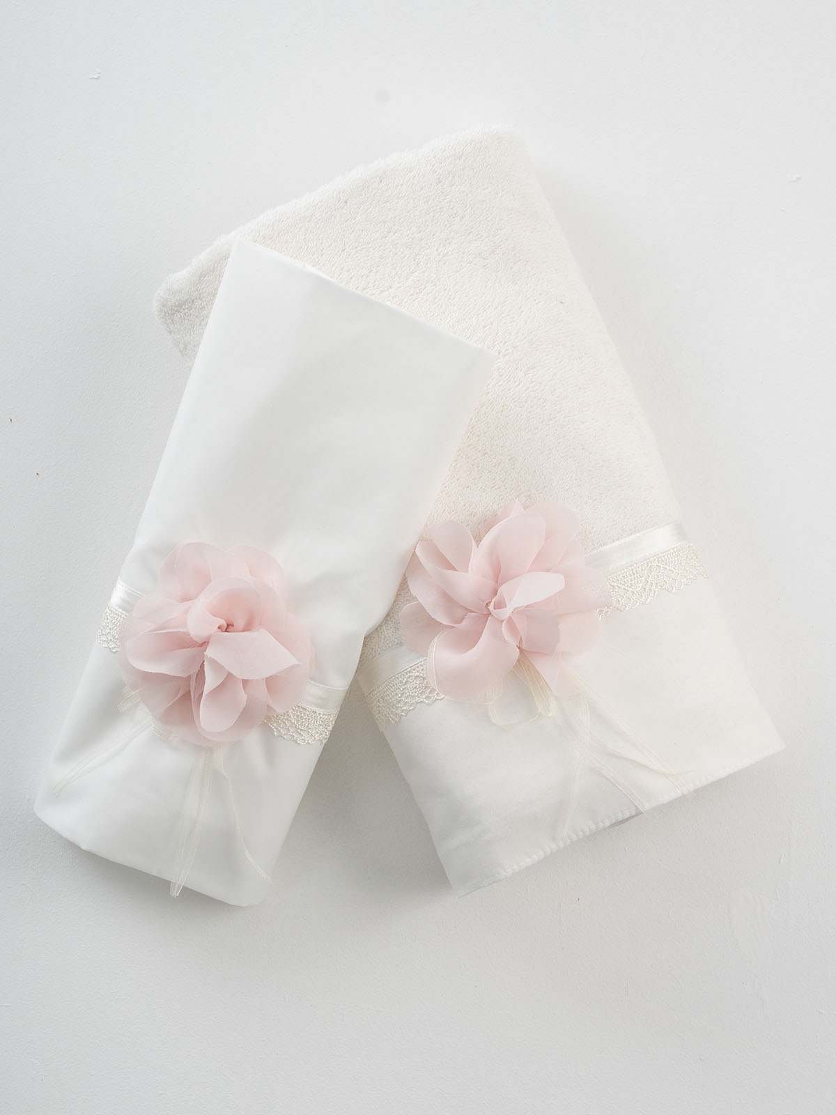 Σετ λαδόπανα Piccolino. Αποτελείται απο βαμβακερό λαδόπανο, πετσέτα 140*70εκ, εσώρουχα και πετσέτα ιερέα 30*50εκ. Στολισμένα με χειροποίητα υφασμάτινα λουλούδια.
