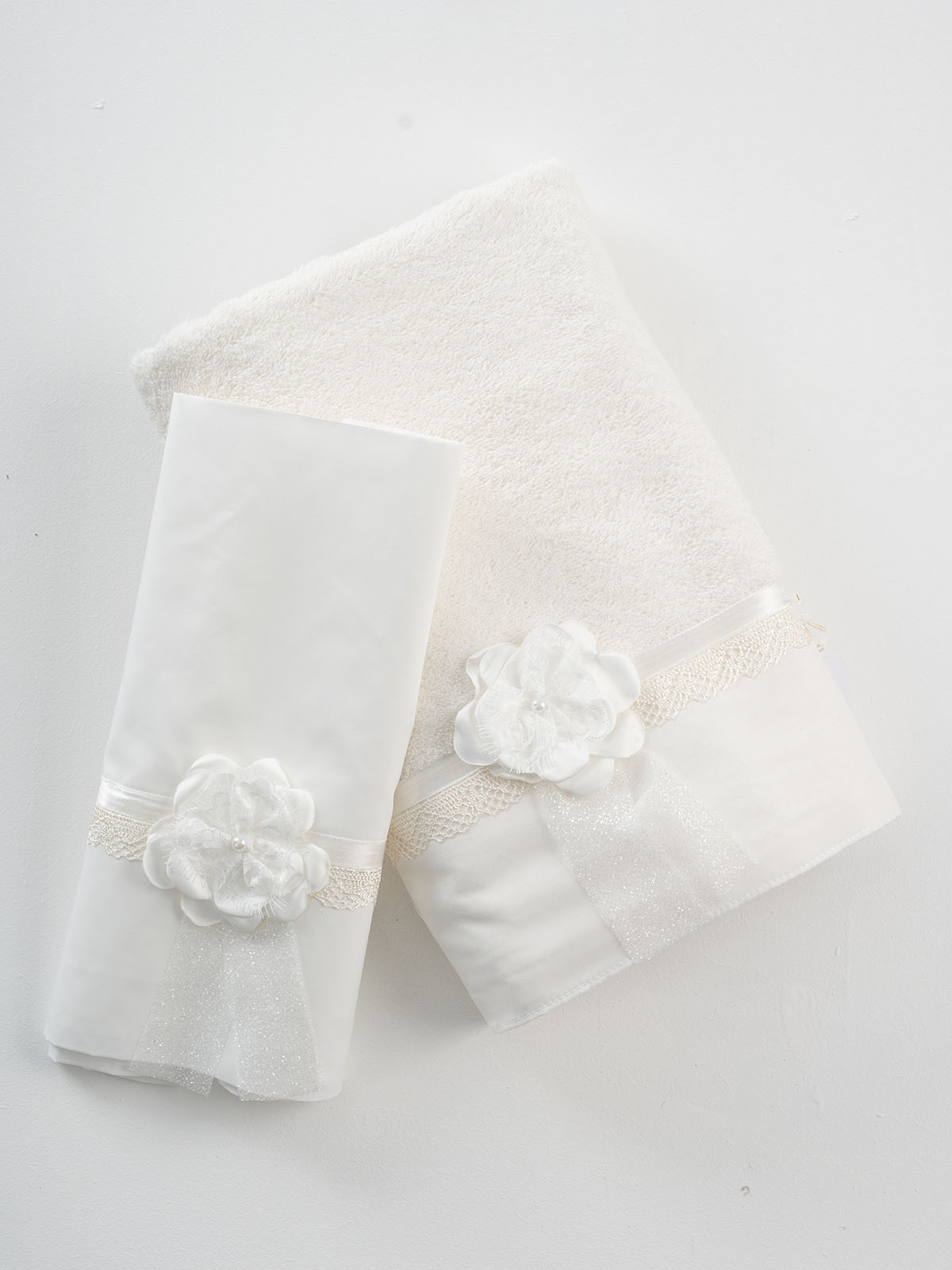 Σετ λαδόπανα Be Fabulous BFLK-EMILY IVORY. Αποτελείται απο βαμβακερό λαδόπανο, πετσέτα 140*70εκ, εσώρουχα και πετσέτα ιερέα 30*50εκ. Στολισμένα με χειροποίητα υφασμάτινα λουλούδια. Συνοδευτικό του φορέματος BE FABULOUS EMILY Ivory