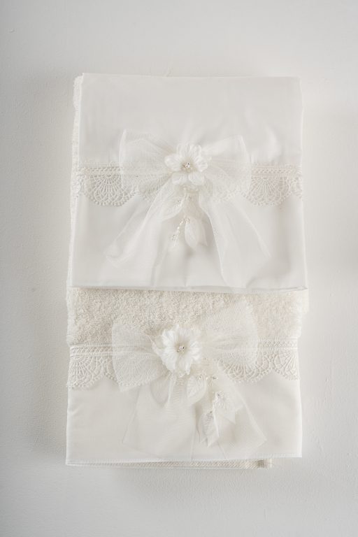 Σετ λαδόπανα Piccolino. Αποτελείται απο βαμβακερό λαδόπανο, πετσέτα 140*70εκ, εσώρουχα και πετσέτα ιερέα 30*50εκ. Στολισμένα με χειροποίητα υφασμάτινα λουλούδια.
