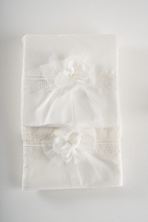 Σετ λαδόπανα Piccolino. Αποτελείται απο βαμβακερό λαδόπανο, πετσέτα 140*70εκ, εσώρουχα και πετσέτα ιερέα 30*50εκ. Στολισμένα με χειροποίητα υφασμάτινα λουλούδια.