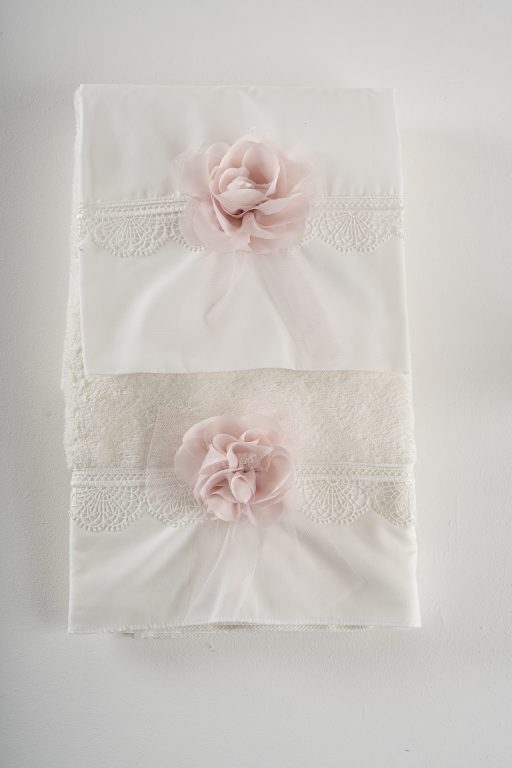 Σετ λαδόπανα Piccolino. Αποτελείται απο βαμβακερό λαδόπανο, πετσέτα 140*70εκ, εσώρουχα και πετσέτα ιερέα 30*50εκ. Στολισμένα με χειροποίητα υφασμάτινα λουλούδια.