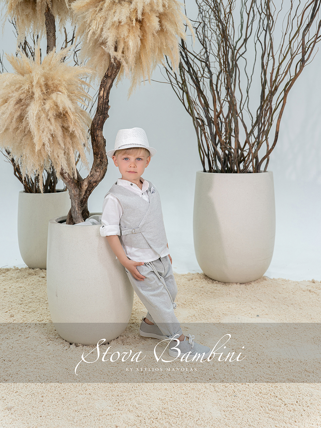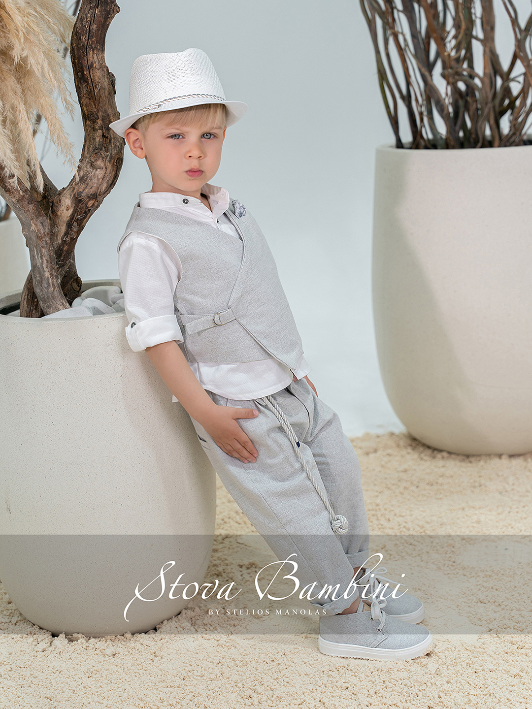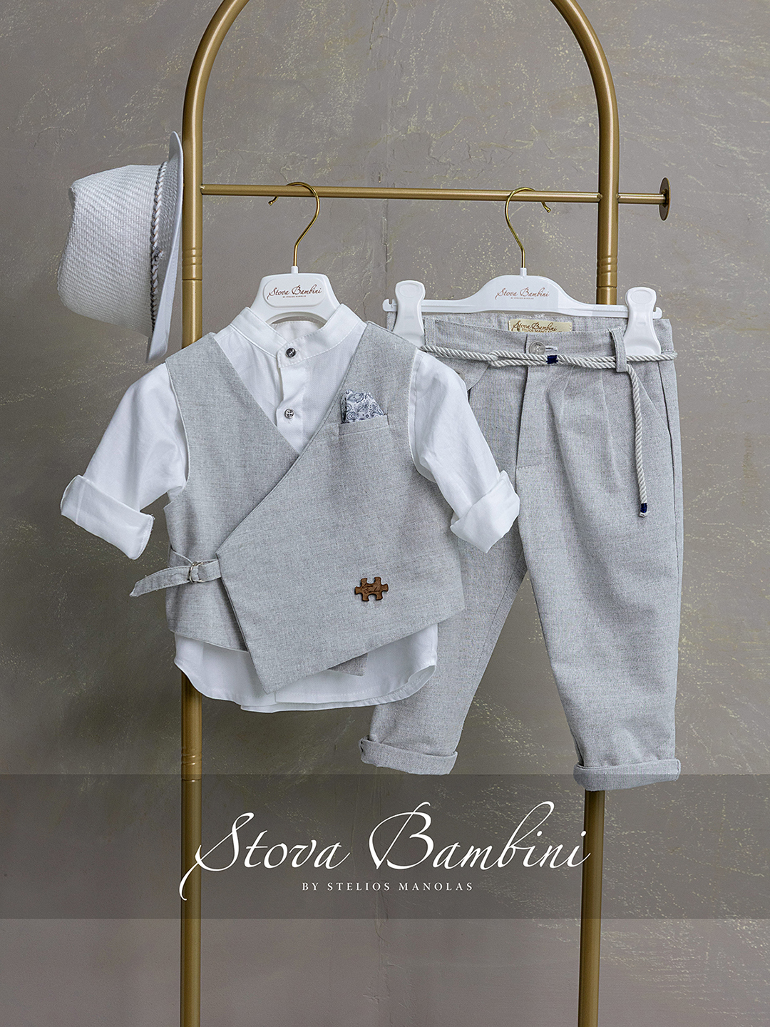 Stova Bambini Βαπτιστικό σύνολο 6 τεμ. από 100% Top Quality Cotton. Το κλασικό wrap-style γιλέκο Stova από 100% Cotton σε γκρι απόχρωση αναδεικνύει τον διαχρονικό χαρακτήρα του brand. Άψογα συνδυασμένο με βαμβακερό πουκάμισο Ισπανίας με Mao γιακά σε λευκή απόχρωση , ενώ το νέο σχέδιο παντελονιού Stova στην ίδια γκρι απόχρωση, προσφέρει άψογη εφαρμογή και δένει αρμονικά με την μοναδική πλεκτή ζώνη απο φυσικό σχοινί με signature κόμπο. Το σύνολο ολοκληρώνεται με ιταλικό pochette με ιδιαίτερο print και ασορτί καπέλο, δημιουργώντας ένα ολοκληρωμένο, Stova look.