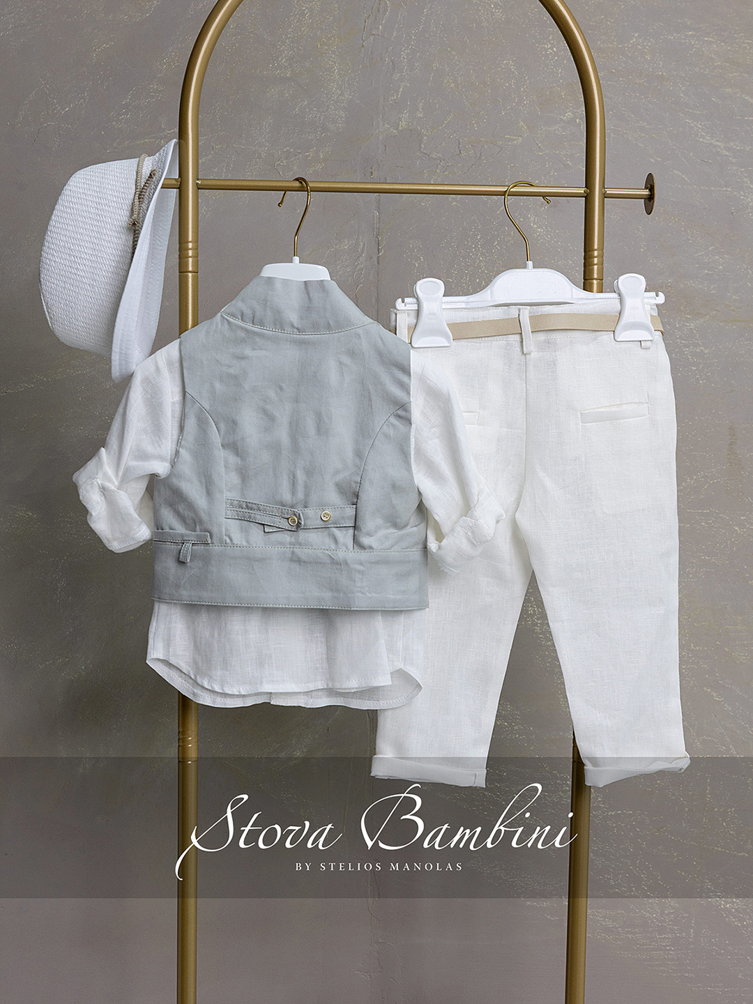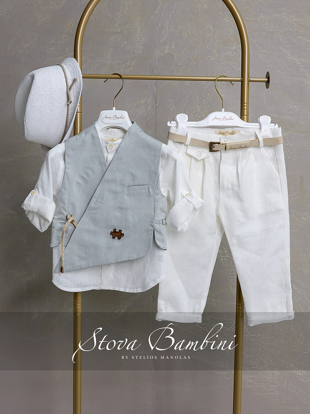 Stova Bambini βαπτιστικό σύνολο 4 τεμ. σχεδιασμένο με minimal αισθητική και εκλεπτυσμένο χαρακτήρα.Το ιδιαίτερο κρουαζέ γιλέκο, εμπνευσμένο από Japanese tailoring, ξεχωρίζει για τη σύγχρονη γραμμή του και το διακριτικό ανάγλυφο μοτίβο από Ιταλικό βαμβάκι που του χαρίζει μοναδική υφή. Το πουκάμισο είναι κατασκευασμένο από 100% λινό ύφασμα, με γιακά Mao, προσφέροντας ανάλαφρη αίσθηση και φυσική κομψότητα, ιδανική για τις ζεστές ημέρες του καλοκαιριού. Το σύνολο ολοκληρώνεται με λινό παντελόνι σε άνετη γραμμή, που διατηρεί την αρμονία και τη φινέτσα του outfit. Η δερμάτινη ζώνη, με ανάγλυφο το λογότυπο Stova Bambini, αποτελεί τη λεπτομέρεια που κάνει τη διαφορά, προσθέτοντας έναν διακριτικό τόνο πολυτέλειας και αυθεντικότητας.