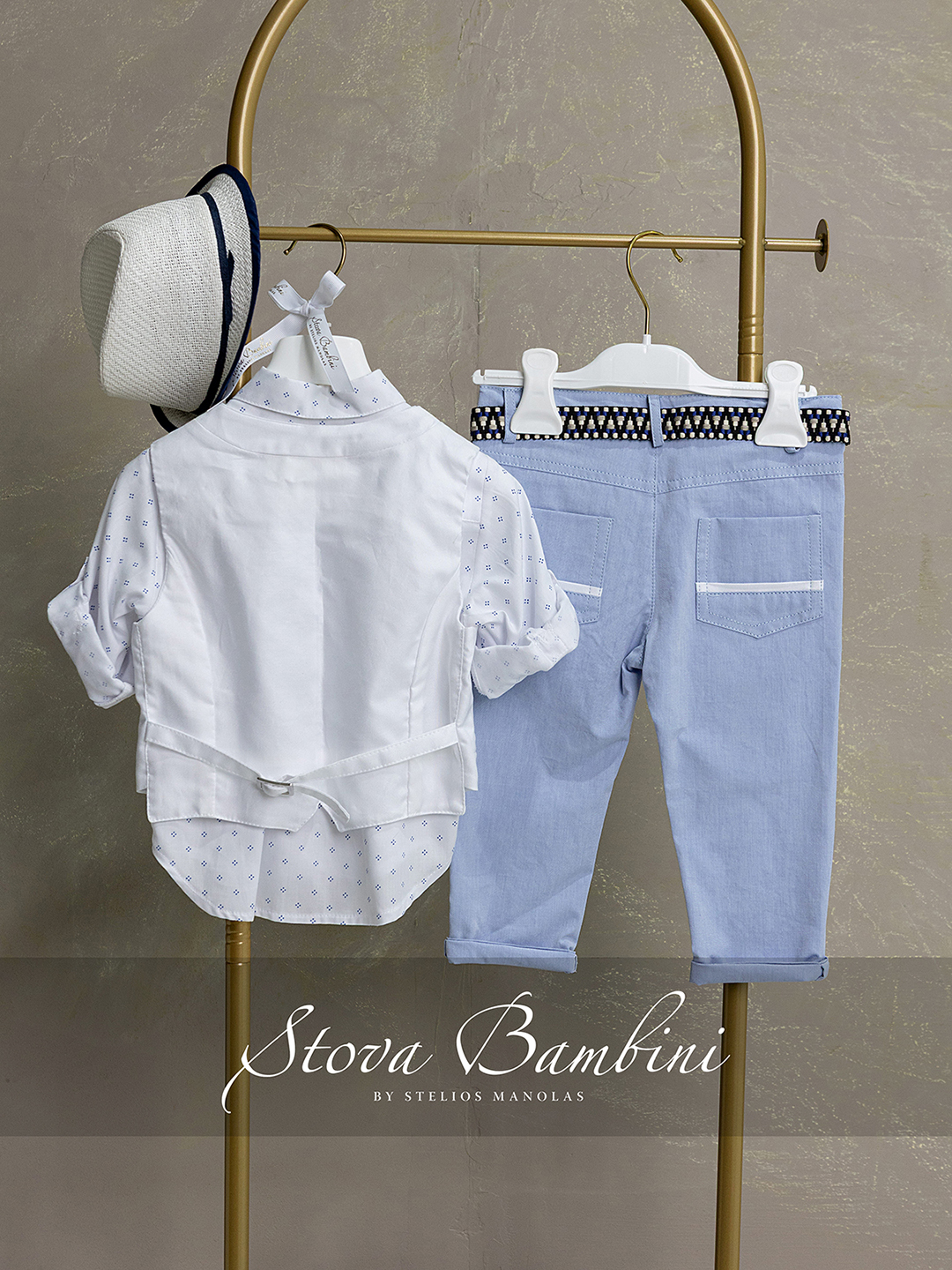 Stova Bambini βαπτιστικό σύνολο 5 τεμ. από υψηλής ποιότητας βαμβάκι, ιδανικό για τις ζεστές καλοκαιρινές εμφανίσεις με κομψότητα και άνεση. Το γιλέκο, σε κλασική γραμμή και λευκή απόχρωση, ξεχωρίζει για την καθαρή, διαχρονική αισθητική του και διαθέτει 3 κουμπιά που ενισχύουν τον refined χαρακτήρα του. Το πουκάμισο είναι Ισπανικό, από εξαιρετικής ποιότητας βαμβάκι, με διακριτικό printed μοτίβο σε απόχρωση που δένει με το γιλέκο, δημιουργώντας ένα απόλυτα ισορροπημένο και καλαίσθητο αποτέλεσμα. Το γαλάζιο βαμβακερό παντελόνι, σε καθαρή γραμμή, συνοδεύεται από ζώνη που ολοκληρώνει το outfit με κομψότητα και πρακτικότητα, ενώ το καπέλο έρχεται να προσθέσει την τελική πινελιά στυλ, χαρίζοντας μια ολοκληρωμένη, sophisticated εμφάνιση.