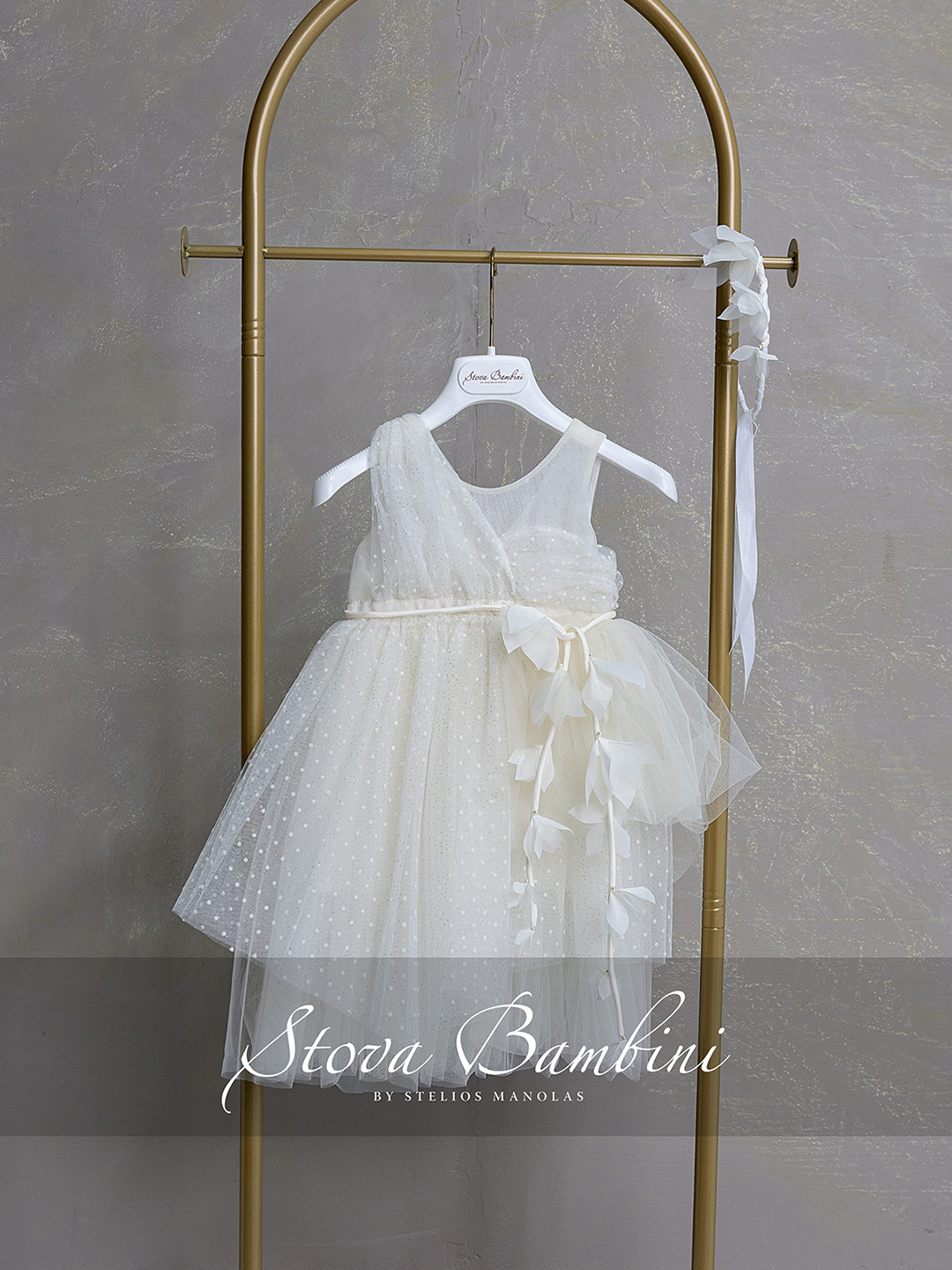 Αέρινο και ρομαντικό φόρεμα σε απαλή ivory απόχρωση, σχεδιασμένο για να ξεχωρίζει με τη διακριτική του κομψότητα. Το ασύμμετρο μπούστο από φίνο Tulle Flock και glitter δημιουργεί ένα ιδιαίτερο draped αποτέλεσμα, χαρίζοντας μοναδική υφή και κίνηση στο σύνολο. Η φούστα από ανάλαφρο Tulle Flock και glitter αγκαλιάζει αρμονικά τη σιλουέτα, ενώ οι διαφορετικές στρώσεις σε ivory τόνους προσθέτουν βάθος και ονειρική αίσθηση. Η λεπτή ζώνη στη μέση (Γαλλίας) ολοκληρώνεται με εντυπωσιακή χειροποίητη σύνθεση από υφασμάτινα λουλούδια και διακριτικές λεπτομέρειες, προσδίδοντας έναν ιδιαίτερα φίνο χαρακτήρα. Όλα τα φορέματα διαθέτουν εσωτερική επένδυση 100% Cotton για απόλυτη άνεση.