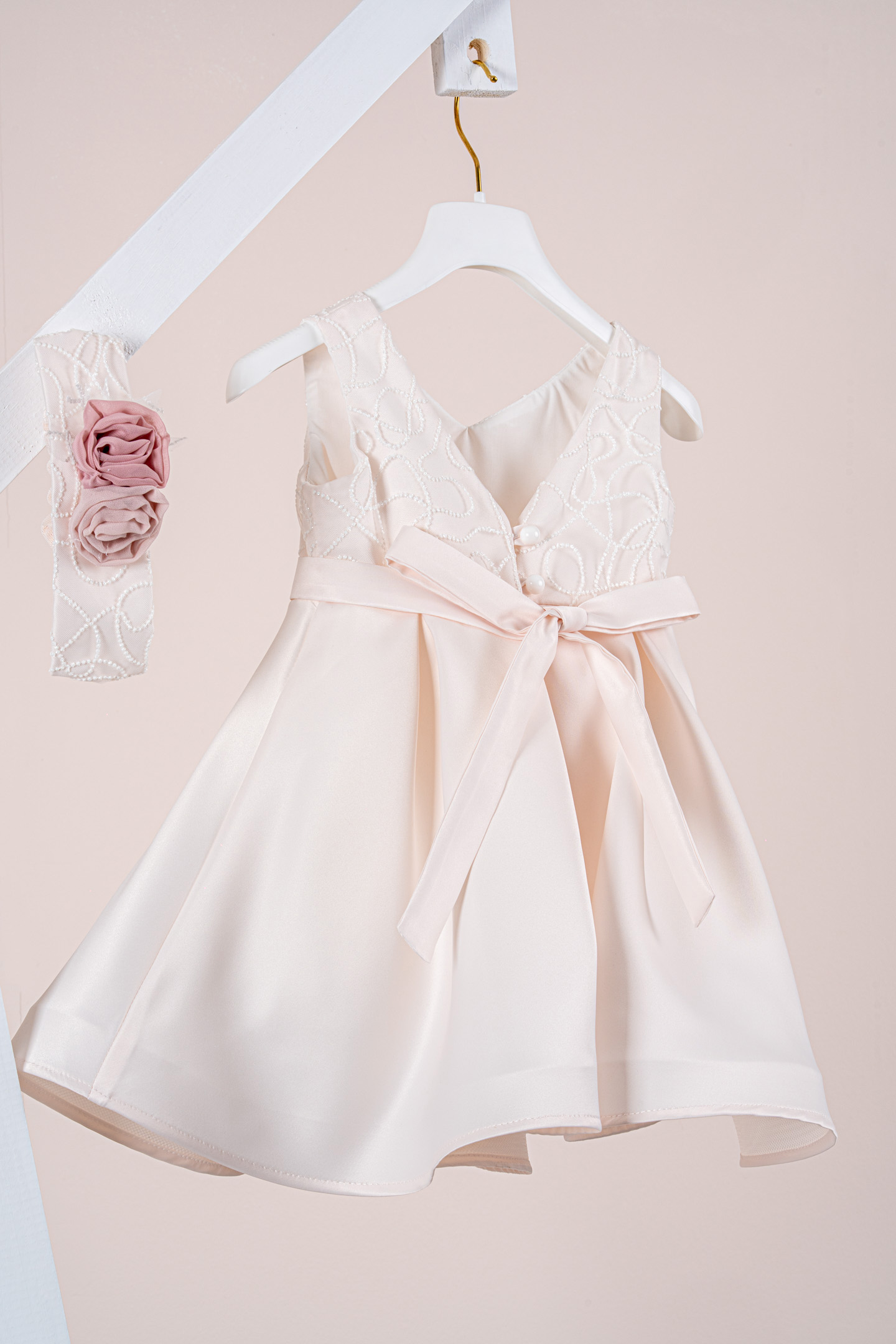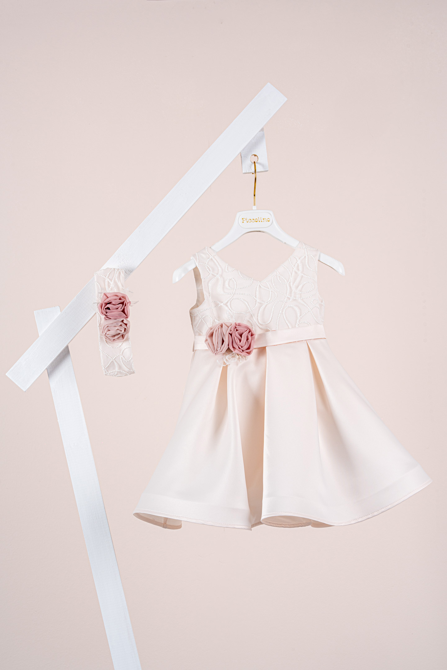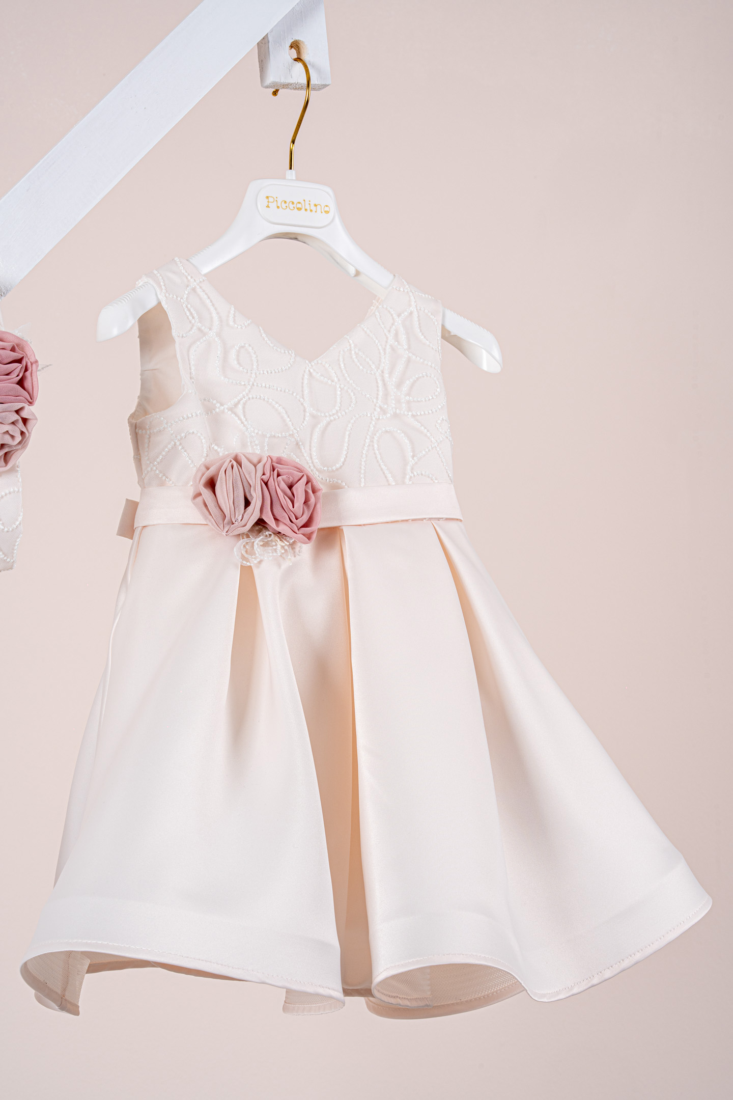 Βαπτιστικό φόρεμα Piccolino Carolina Champagne. Ένα εντυπωσιακό chic φόρεμα από σατέν ύφασμα. Μπούστο με λαιμόκοψη σε σχήμα καρδιάς και επίστρωση λαμπερής δαντέλας με γκλίτερ. Φούστα από σατέν ύφασμα που σχηματίζει πιέτες κάνοντας το φόρεμα μοναδικά ξεχωριστό. Το ντεκόρ του φορέματος αποτελείται από σατέν ζωνάκι και σύνθεση με χειροίητα λουλούδια. Το φόρεμα συνοδέυεται απο κορδέλα με ντεκόρ όμοιο με το φόρεμα. Διαθέσιμο σε 4 μεγέθη: 6-12, 12-18, 18-24, 24-36(εξτρά χρέωση).
