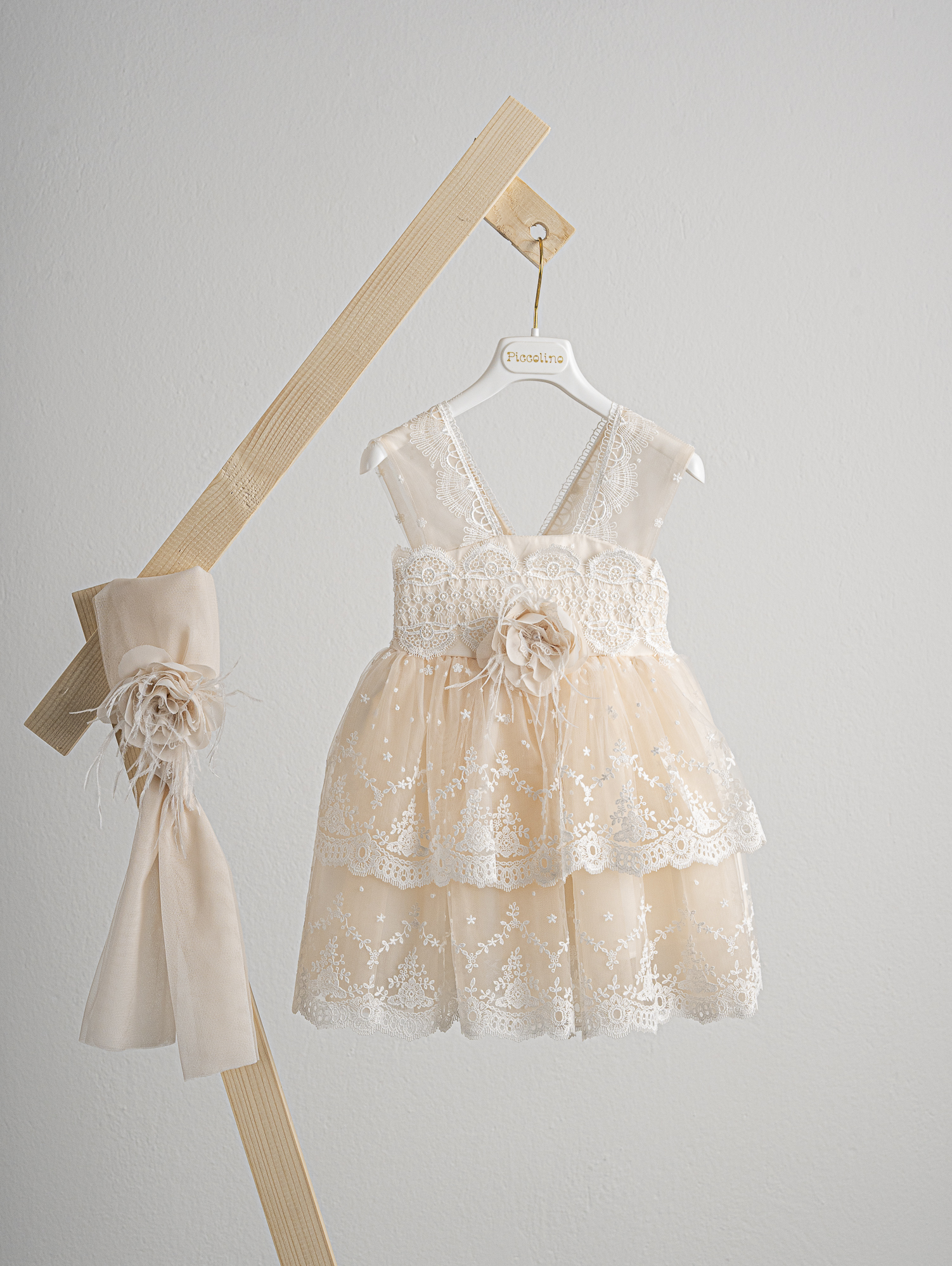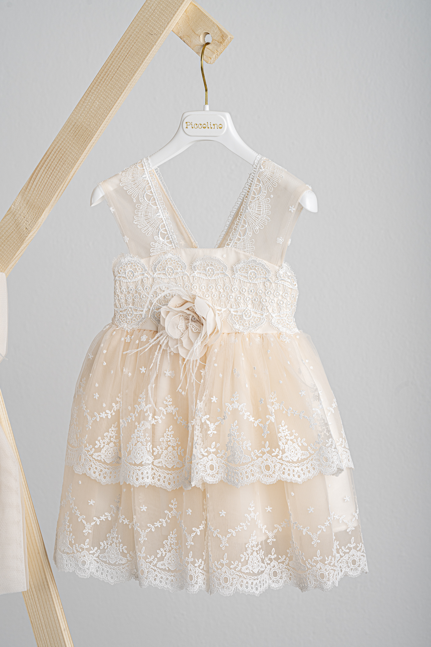 Βαπτιστικό φόρεμα Piccolino Estelle Champagne.Ρομαντικό φόρεμα με μπούστο από δαντέλα, τιράντες από τούλι και δαντέλα και φούστα δύο επιπέδων με δαντέλα με όμορφο τελείωμα. Πλάτη σε σχήμα V με δαντέλα και φιόγκο. Το ντεκόρ του φορέματος αποτελείται απο χειροποίητο λουλούδι. Το φόρεμα συνοδέυεται απο μπαντάνα με ντεκόρ όμοιο με το φόρεμα. Διαθέσιμο σε 4 μεγέθη: 6-12, 12-18, 18-24, 24-36(εξτρά χρέωση)