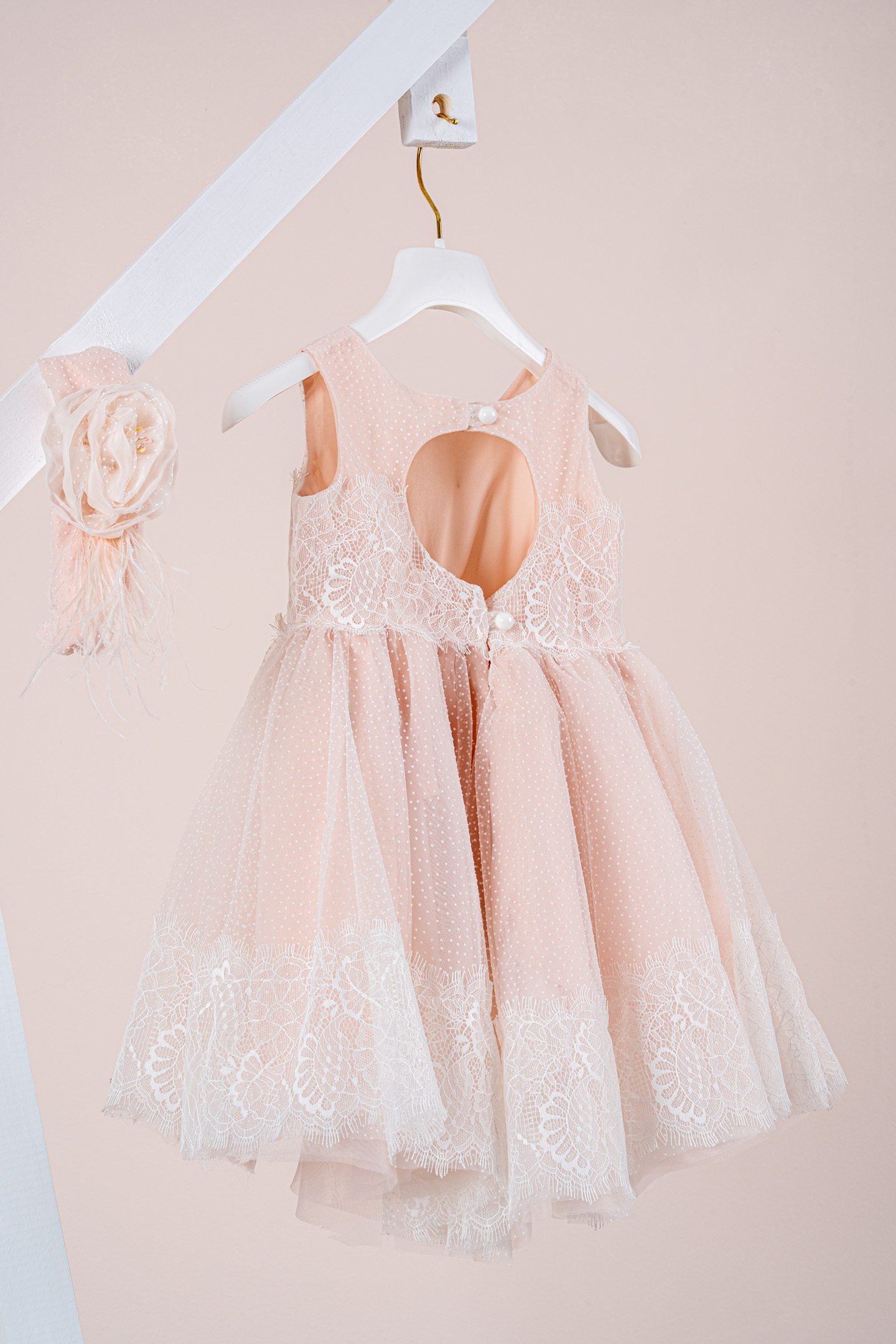 Βαπτιστικό φόρεμα Piccolino Marcella Peach. Εντυπωσιακό ασσύμετρο φόρεμα με μπούστο από πουά τούλι και γαλλική δαντέλα και με μία εντυπωσιακή φούστα από πουά τούλι με γαλλική δαντέλα στο τελειώμα της και μακριά στο πίσω μέρος της. Το πίσω μέρος του φορέματος με το κυκλικό άνοιγμα κλέβει τις εντυπώσεις. Το ντεκόρ του φορέματος αποτελείται από χειροποίητο λουλούδι και πούπουλα μαραμπού. Το φόρεμα συνοδέυεται απο κορδέλα με ντεκόρ όμοιο με το φόρεμα. Διαθέσιμο σε 4 μεγέθη: 6-12, 12-18, 18-24, 24-36(εξτρά χρέωση).
