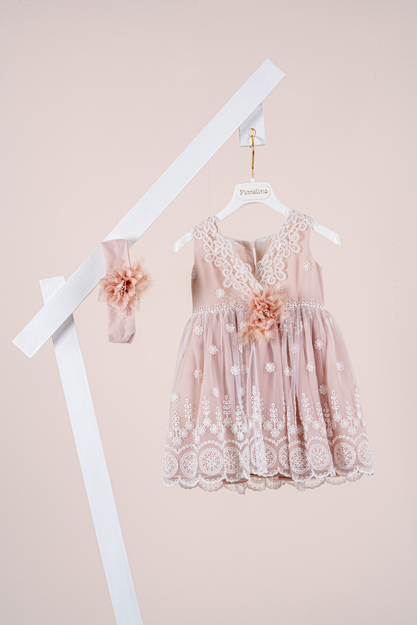 Βαπτιστικό φόρεμα Piccolino Marisol Powder. Ρομαντικό βαπτιστικό φόρεμα από δαντέλα με μικρές μαργαριτούλες. Στο μπούστο του φορέματος σχηματίζεται λαιμόκοψη σε σχήμα V από δαντελένια τρέσσα. Το ντεκόρ του φορέματος αποτελείται από δαντελένιο ζωνάκι, χειροποίητο λουλούδι και πούπουλα. Το φόρεμα συνοδέυεται απο κορδέλα με ντεκόρ όμοιο με το φόρεμα. Διαθέσιμο σε 4 μεγέθη: 6-12, 12-18, 18-24, 24-36(εξτρά χρέωση).