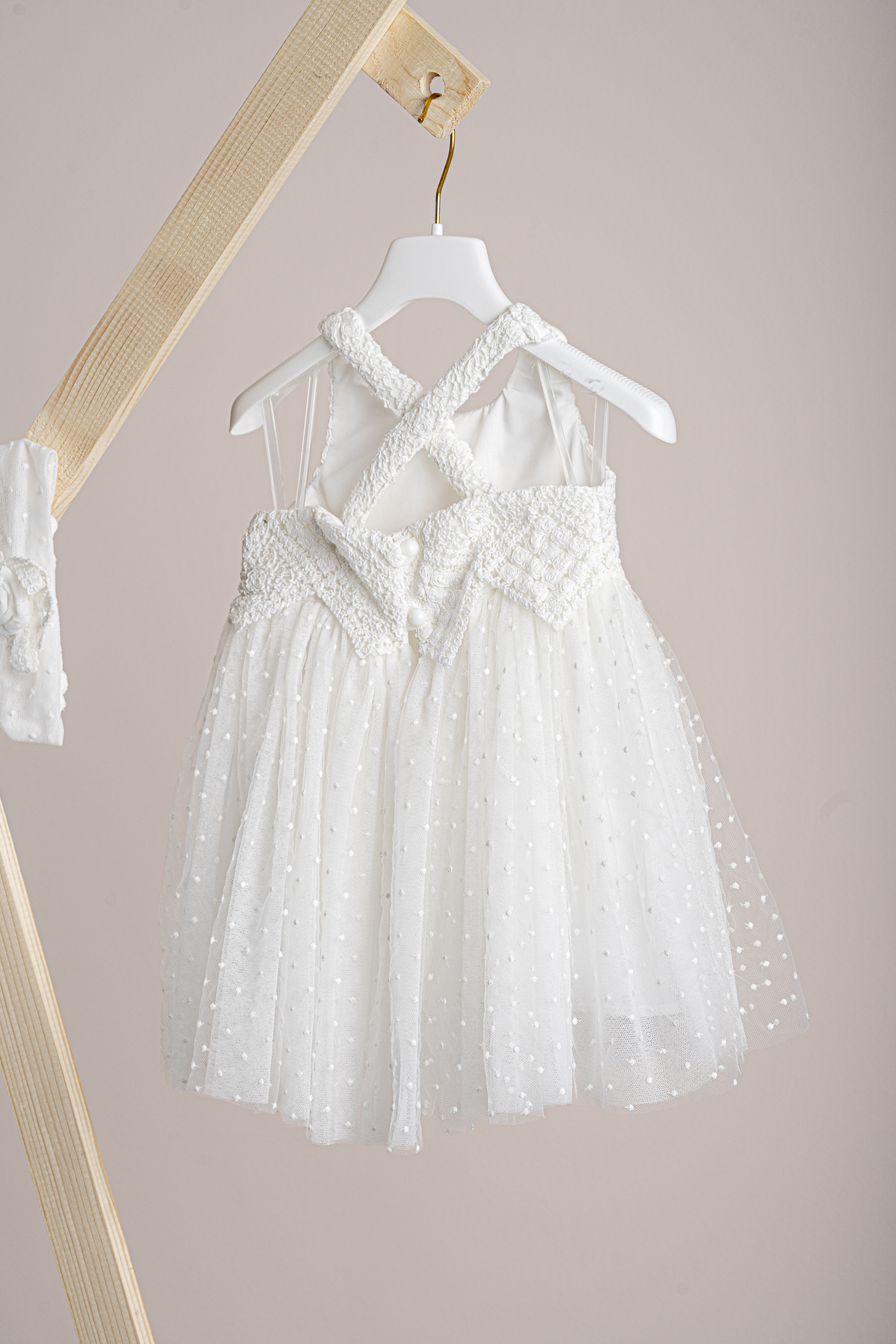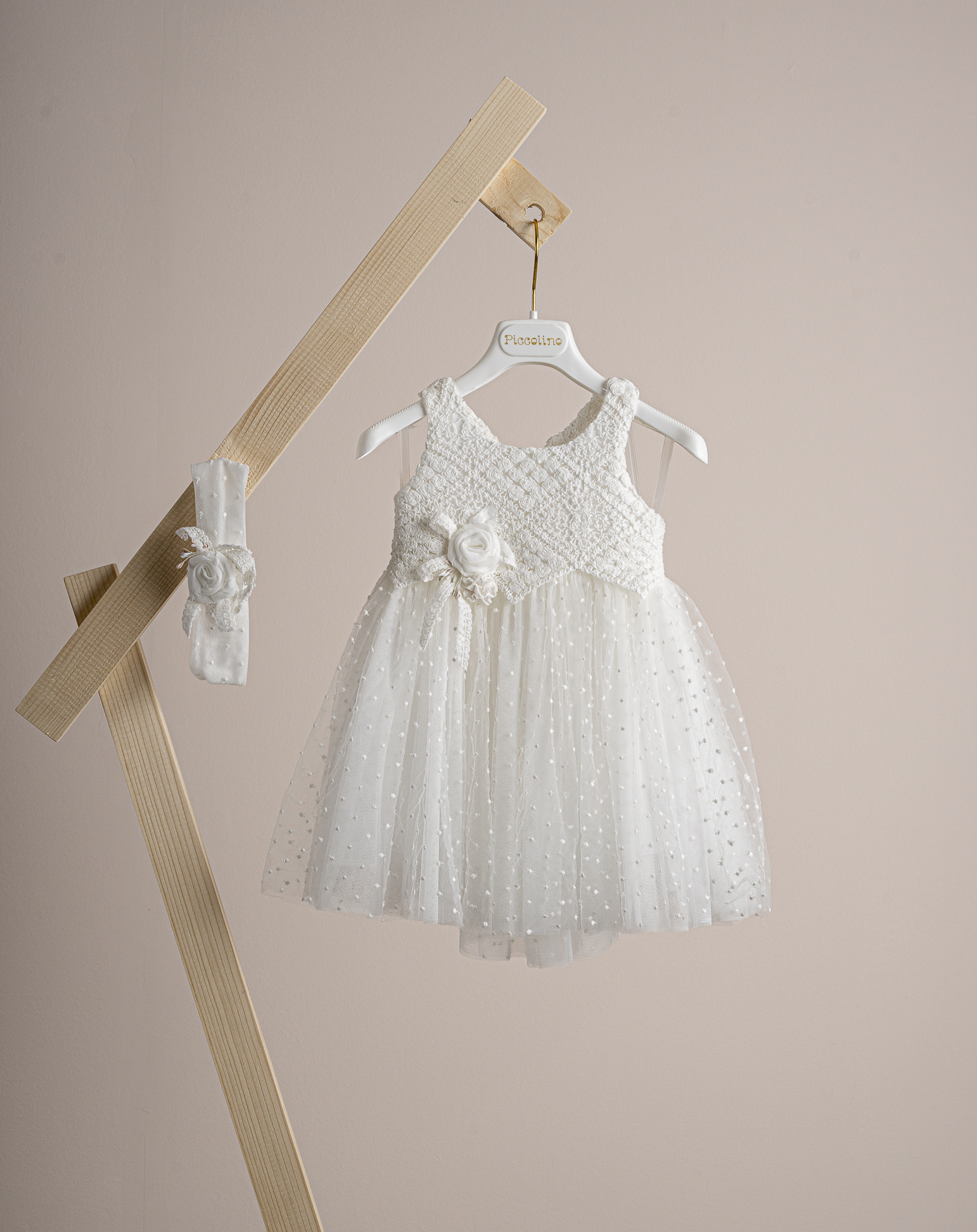 Βαπτιστικό φόρεμα Piccolino Thea Beige. Φόρεμα απο εκρού πλεκτή δαντέλα στο μπούστο και εκρού πουά τουλινη φούστα. Πλάτη με δέσιμο χιαστί απο τις τιράντες. Το ντεκόρ του φορέματος αποτελείται απο χειροποίητο λουλούδι. Το φόρεμα συνοδέυεται απο κορδέλα με ντεκόρ όμοιο με το φόρεμα. Διαθέσιμο σε 4 μεγέθη: 6-12, 12-18, 18-24, 24-36(εξτρά χρέωση)