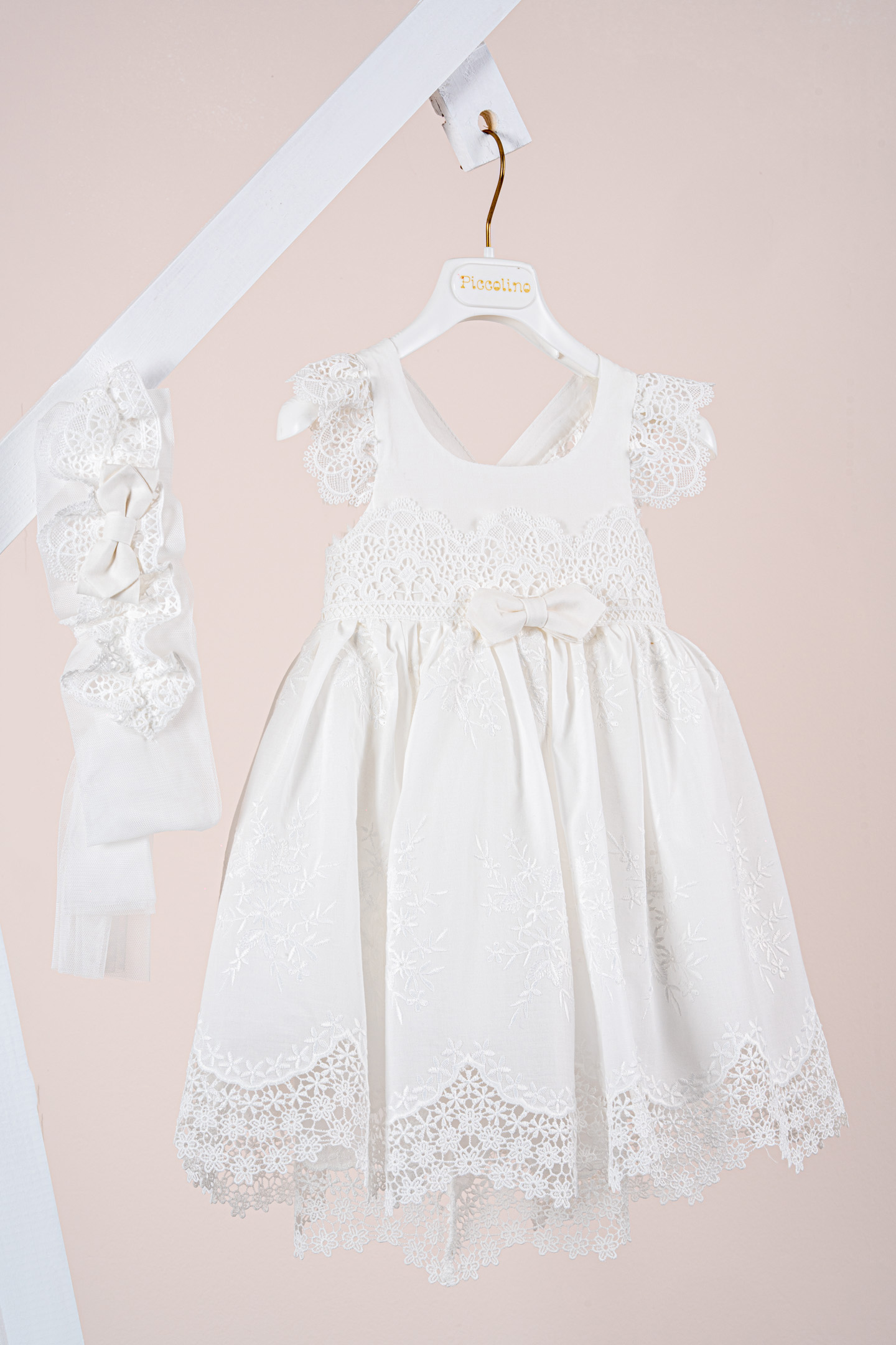 Βαπτιστικό φόρεμα Piccolino Valerie Ivory. Φόρεμα απο εκρού κηπουρ δαντέλα στο μπούστο και εκρού κηπούρ δαντέλα με όμορφο τελείωμα στη φούστα. Πλάτη με δέσιμο χιαστί απο τις τιράντες και δαντελένια μανικάκια.Την πίσω μεριά του φφορέματος διακοσμεί ένας ρομαντικός φιόγκος. Το ντεκόρ του φορέματος αποτελείται απο το δαντελένιο ζωνάκι και από το μικρό διακριτικό φιογκάκι. Το φόρεμα συνοδέυεται απο μπαντάνα με ντεκόρ όμοιο με το φόρεμα. Διαθέσιμο σε 4 μεγέθη: 6-12, 12-18, 18-24, 24-36(εξτρά χρέωση)